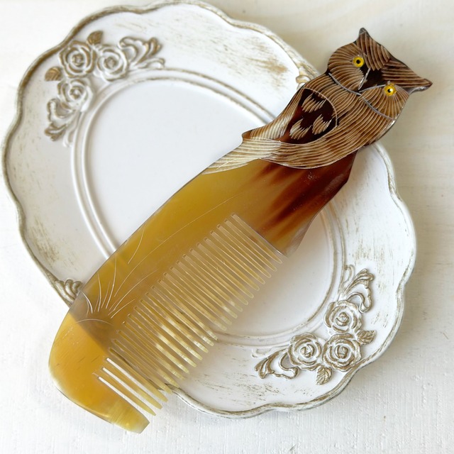 水牛角 バッファローホーン フクロウの彫刻 櫛