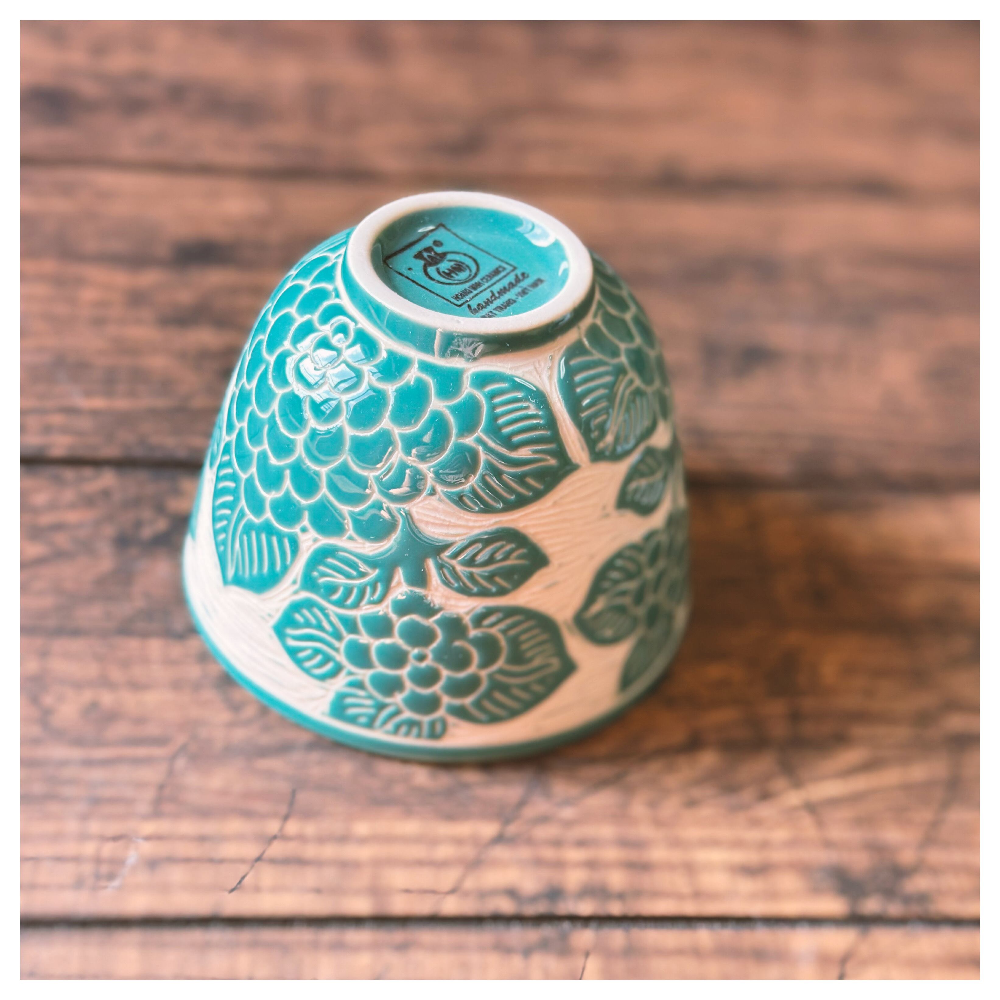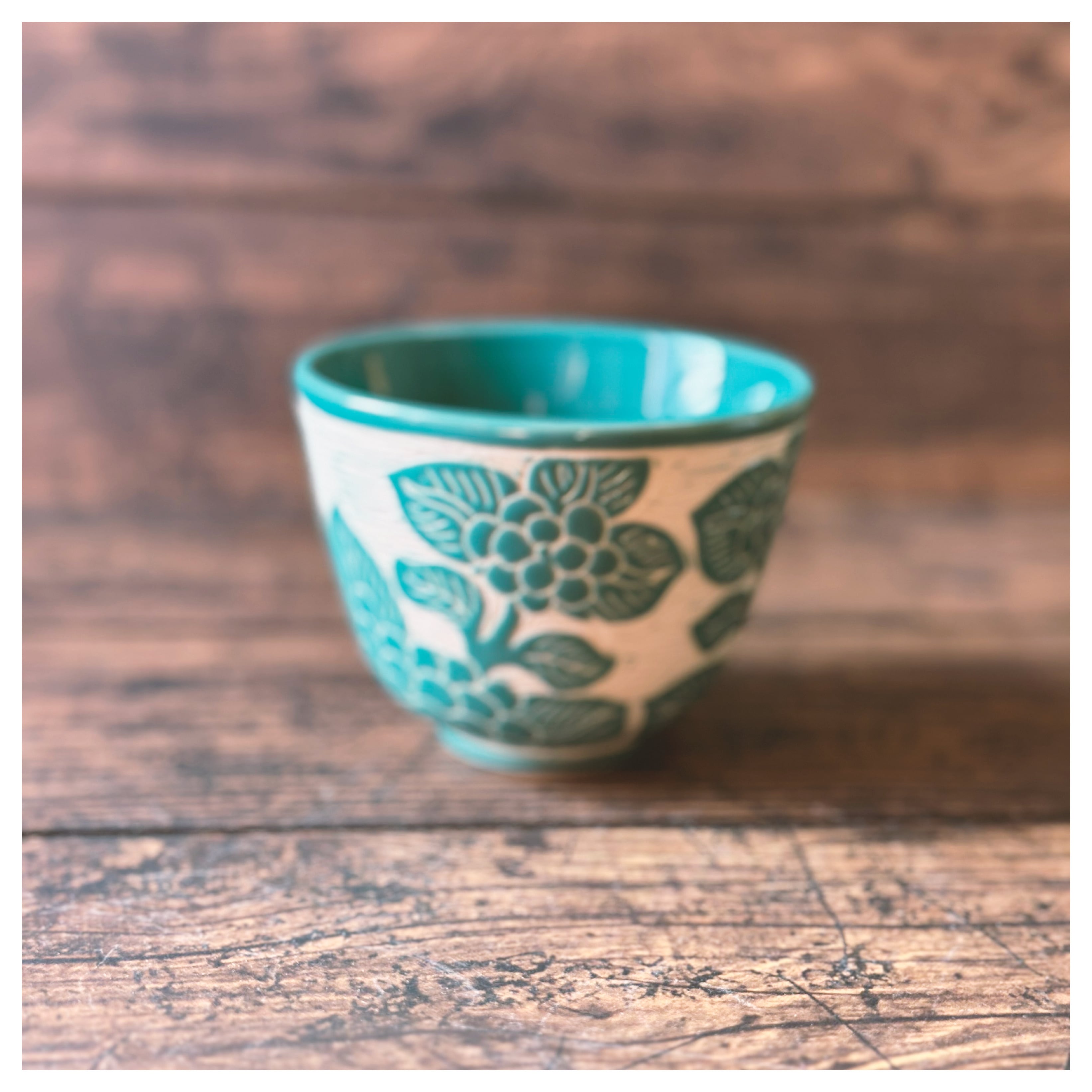 ベトナムのバッチャン焼き 紫陽花柄の彫刻 湯呑み