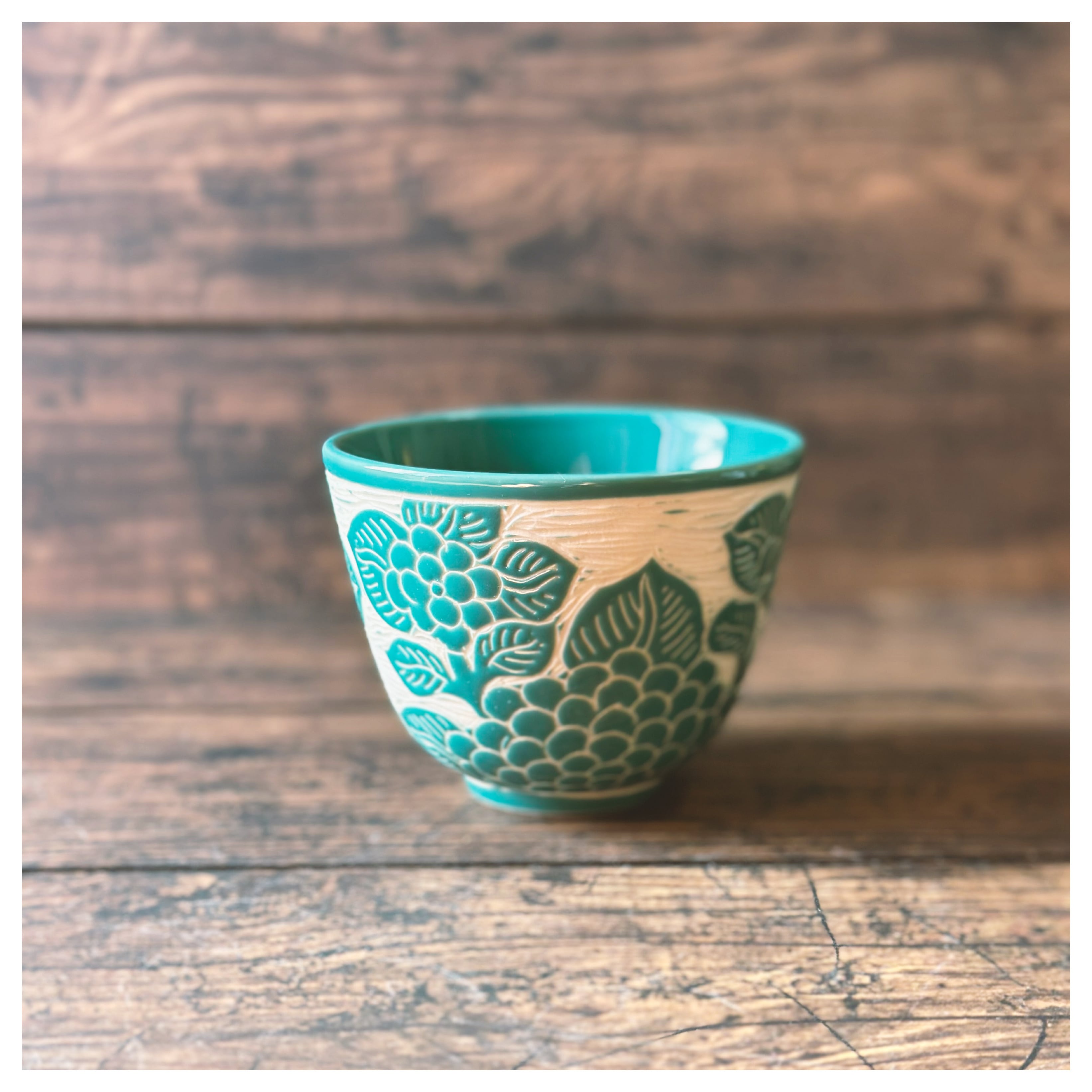 紫陽花柄の彫刻の湯呑み