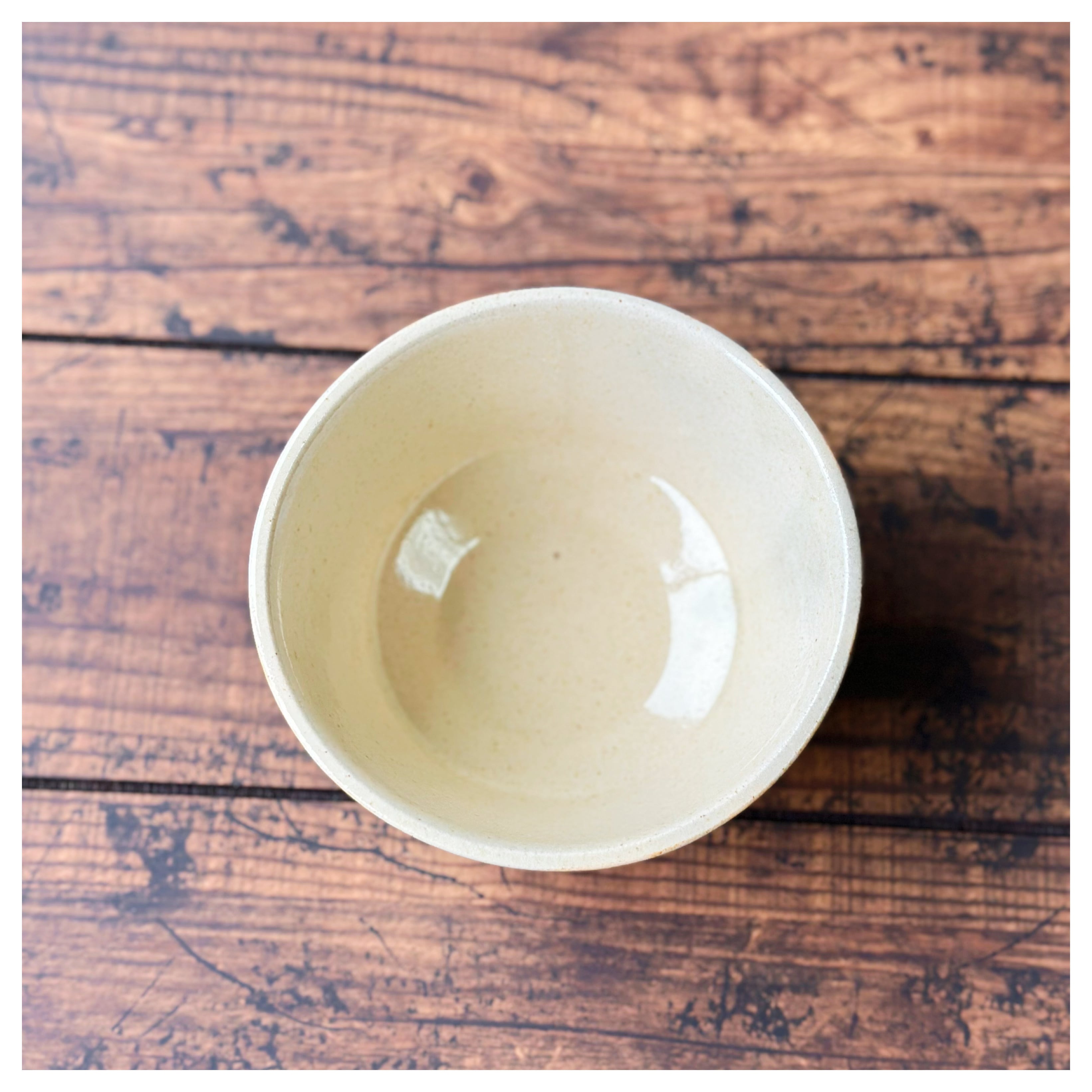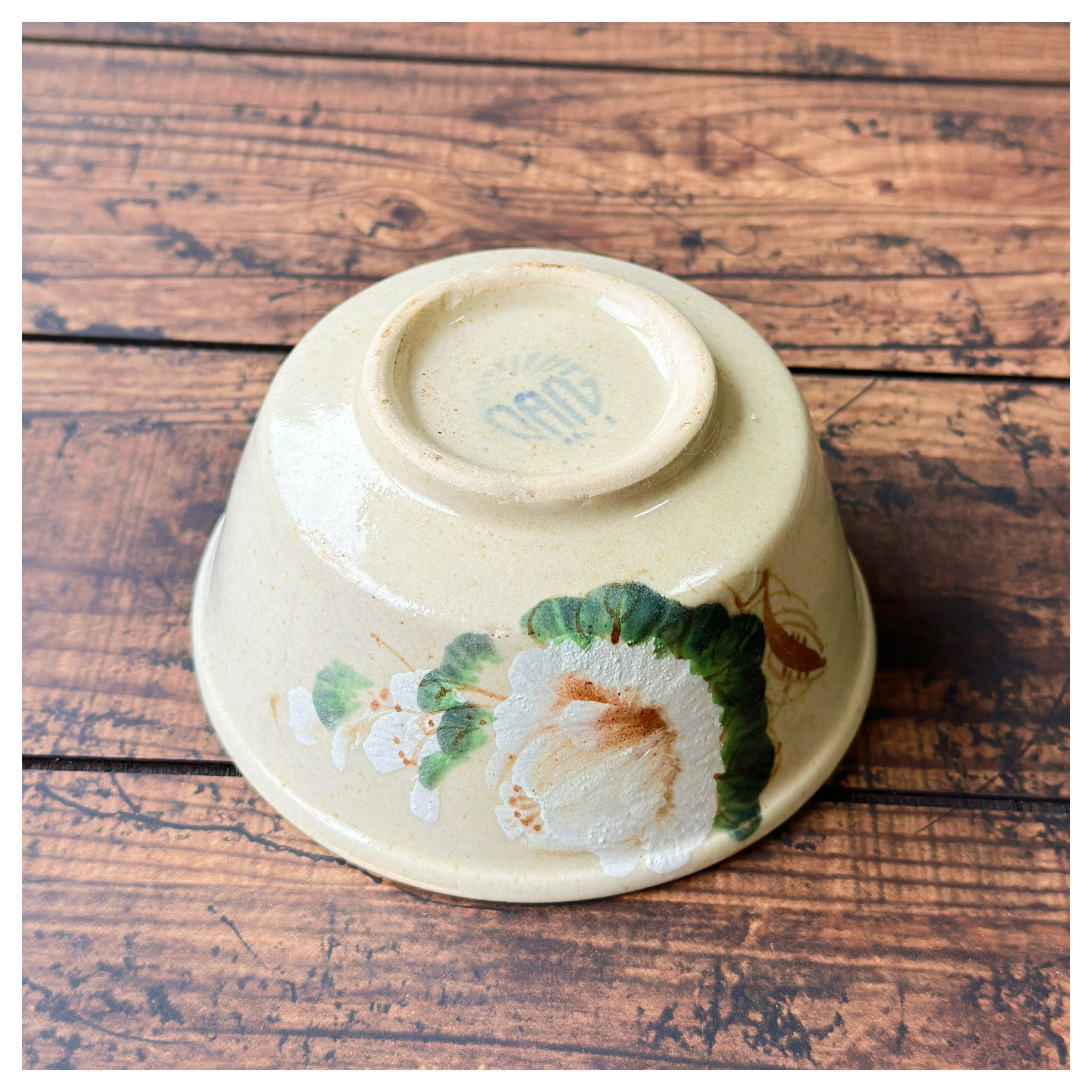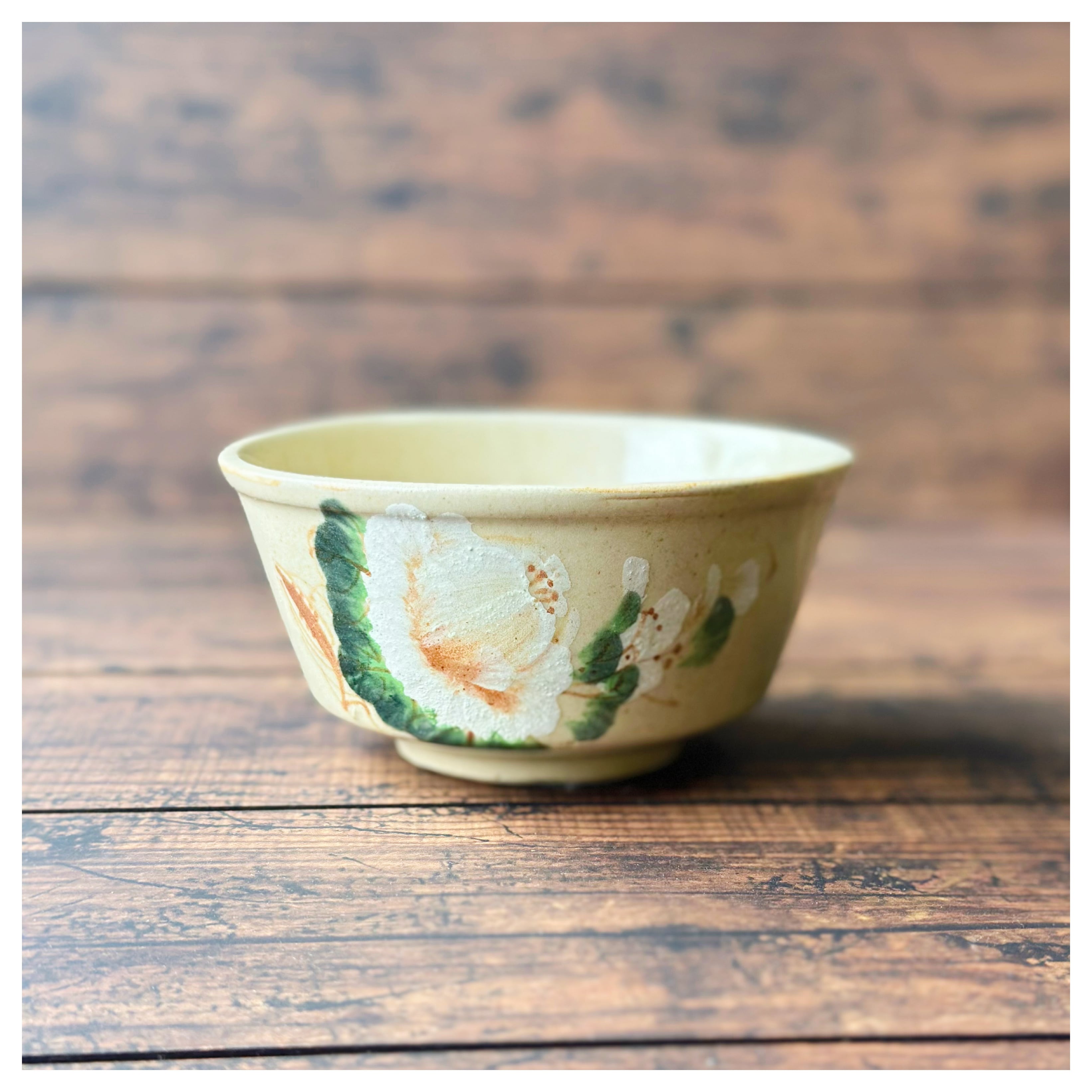 クリーム色の素地に、花などの模様が手描きで大らかに描かれているのが特徴。かつては庶民の日常食器として親しまれ、そのぽってりとした風合いとどこか懐かしい絵柄が魅力です。